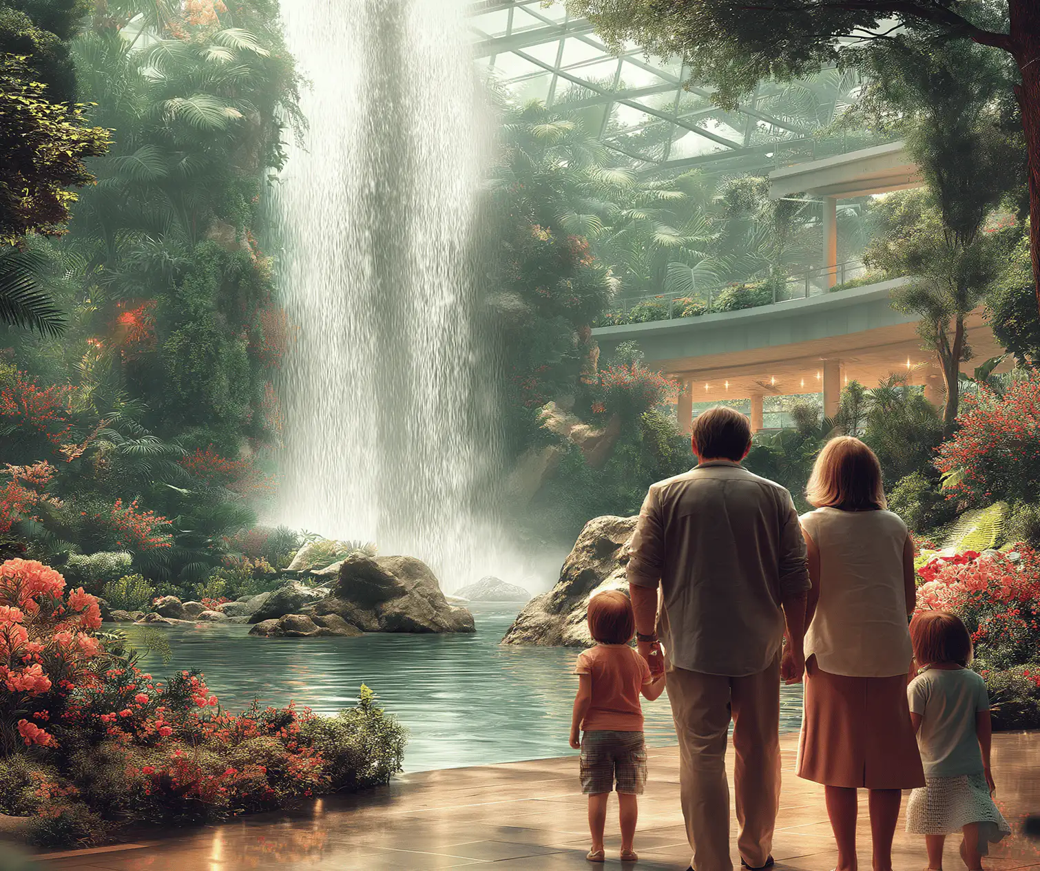 See the giant sculptures, feel the mist and marvel at a towering indoor waterfall surrounded by a tropical oasis.